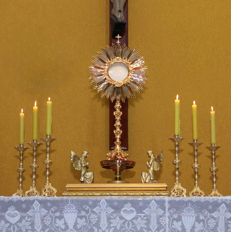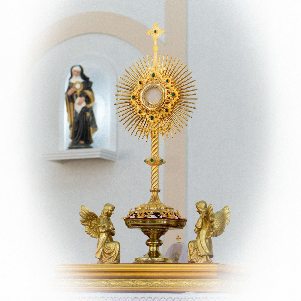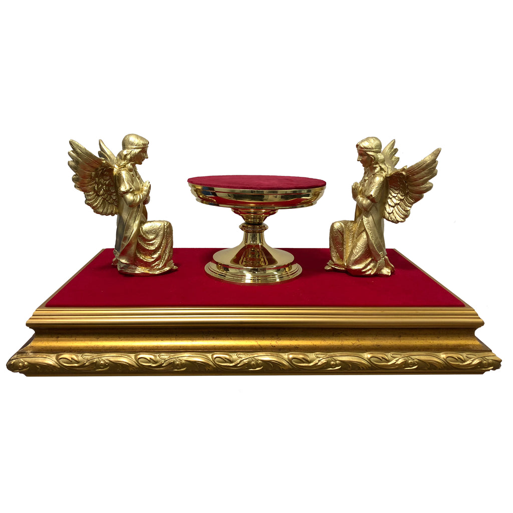 O Trono Angélico é uma digna e imponente peça para a Adoração e a Hora Santa. Possui dois belíssimos Anjos em posição de adoração, feitos em resina e pintados em dourado. Os anjos guarnecem o digno suporte para o Ostensório, banhado a ouro, enquanto se sustentam sobre uma belíssima base dourada com tecido veludo vermelho.