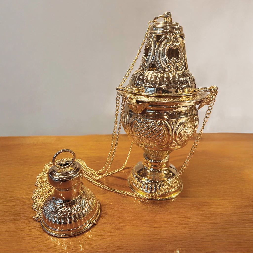 O turíbulo é um dos mais belos e significativos instrumentos da liturgia católica. Este modelo, feito em latão e integralmente banhado a ouro 24 quilates, possui os detalhes de três anjos, de onde saem suas correntes. Toda a superfície da peça é ornada com desenhos cinzelados à mão no próprio material, o que confere um acabamento distinto, de rara beleza e com riqueza de detalhes.