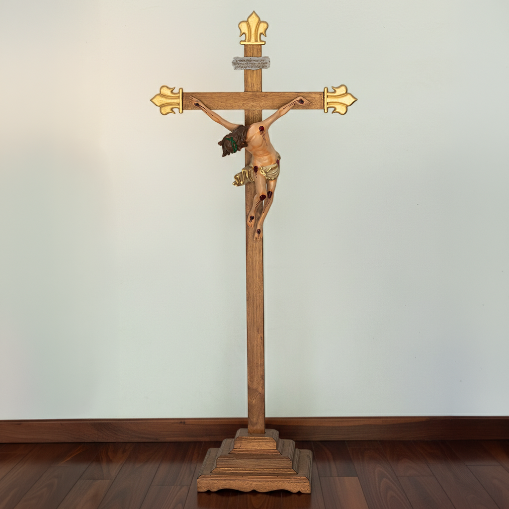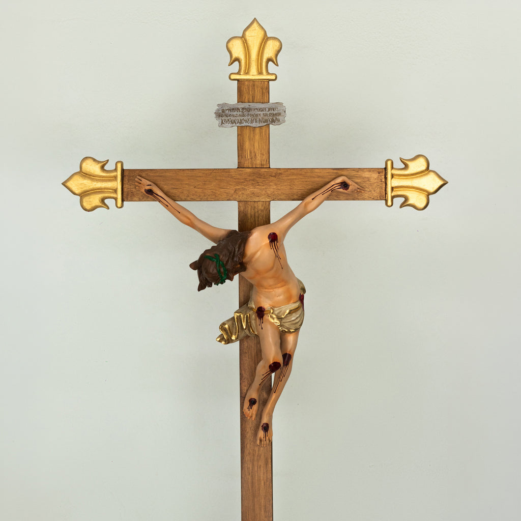 A Cruz é fabricada em madeira maciça de jequitibá-rosa, enquanto a imagem do Senhor Crucificado é feita em resina de alta durabilidade e resistência.