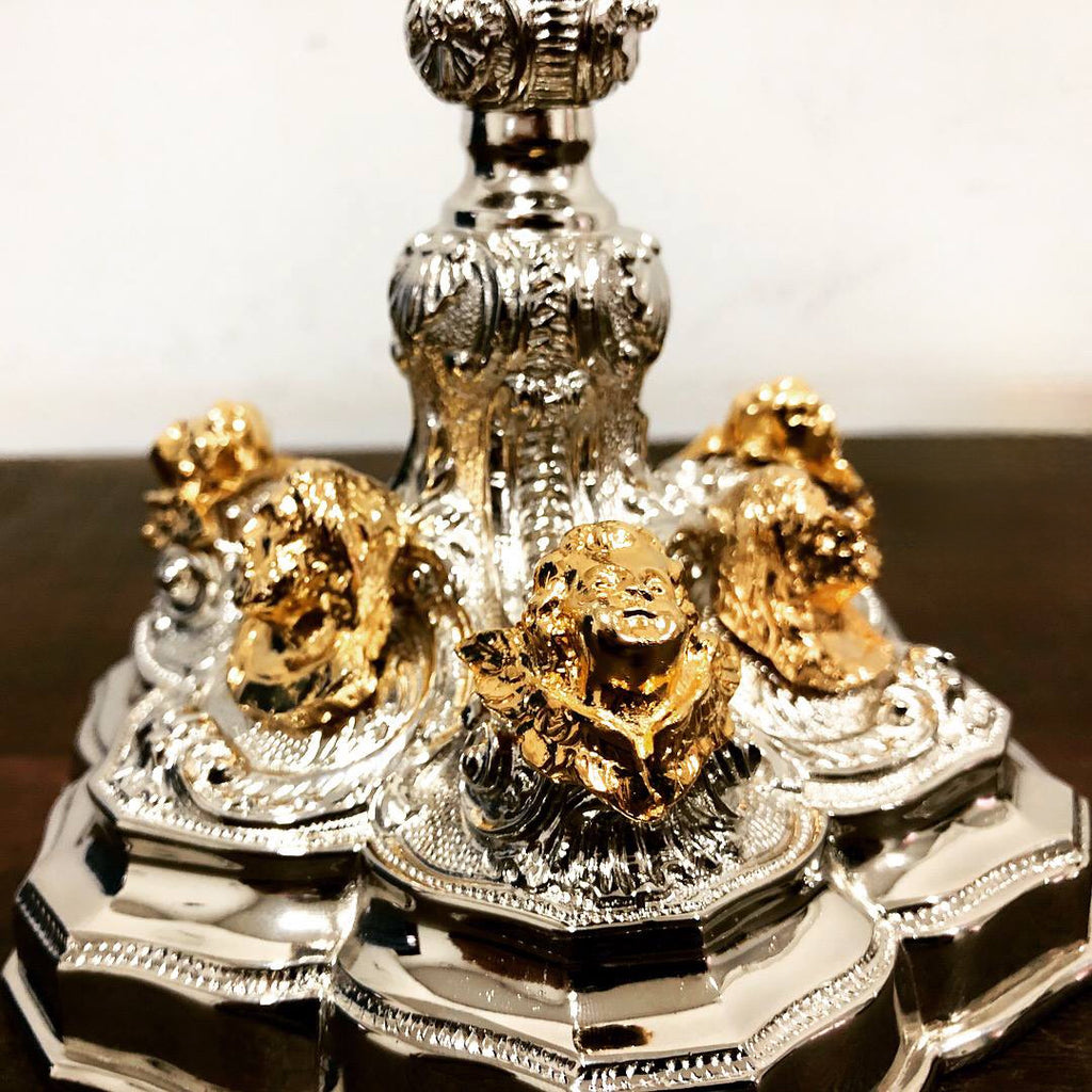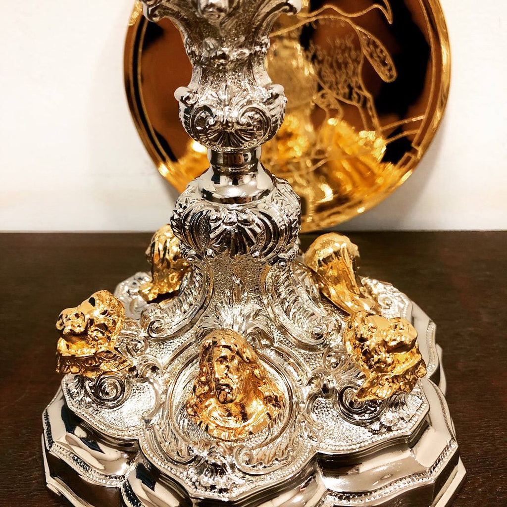 Este belíssimo conjunto de Cálice e Âmbula carrega em sua base os bustos de Jesus, Maria e José. São peças de forte inspiração barroca em sua confecção. A influência barroca manifesta-se nos contornos ornamentados e na riqueza decorativa, seguindo a tradição dos grandes ourives sacros.