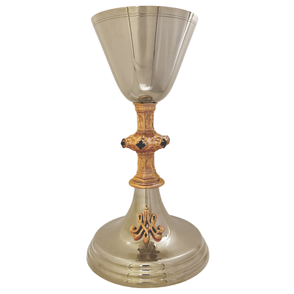 Com o nome de Santa Maria Mãe de Deus, queremos homenagear a Maternidade Divina de Maria, o primeiro dos dogmas marianos, que atesta que Maria é verdadeiramente a Theotókos, Mãe de Deus. Esses belíssimos vasos sagrados carregam em sua base o Mariograma, a letra capitular bordada do nome de Maria. Adornados com bela pedraria azul, cor tipicamente mariana, as peças ainda possuem uma rica coluna trabalhada em estilo gótico, repleta de arcos ogivais. Os arcos em forma de ogiva são elementos característicos da arquitetura gótica e serviam de sustentação para os tão belos vitrais das catedrais medievais. O vitral é símbolo da Virgem Maria: a luz do Sol, para o qual não podemos olhar fixamente, passa pelo vitral sem rompê-lo ou quebrá-lo, embelezando o interior da igreja com uma luz multicolorida. Também Deus, ao se fazer gerar em Maria, a única que, por ser imaculada, pôde vê-Lo diretamente em vida, deixa-a inviolada e intacta e, por Ela, o Verbo Encarnado visita o mundo, cumulando-nos de luz e beleza.