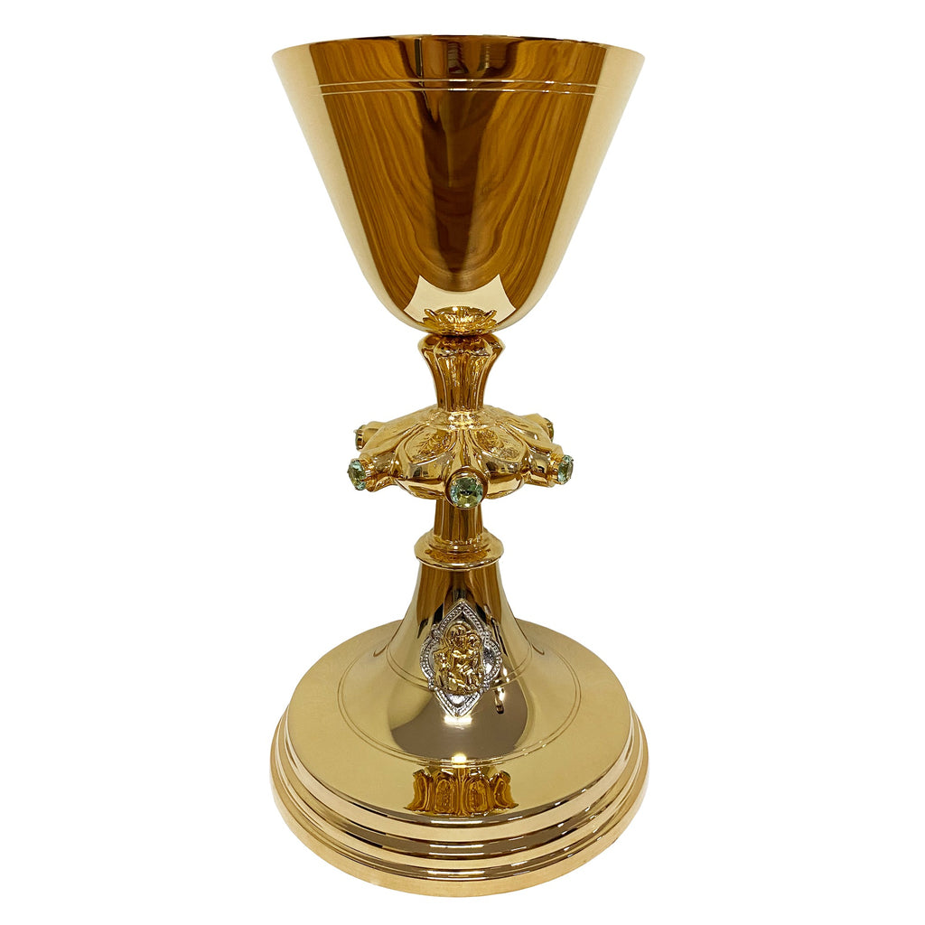 Estes são os vasos sagrados dedicados ao Padroeiro da Santa Igreja, São José. Estas belas peças, de ótimo custo-benefício, carregam em sua base uma medalha com a figura do Pai adotivo de Jesus. A coluna das peças sustenta os copos em formato de um Lírio, símbolo da pureza do Beatíssimo Esposo da Virgem Maria. O conjunto pode acompanhar, à sua escolha, uma bela patena com a figura de São José, segurando em seu colo o Menino Jesus. Embaixo, a tradicional expressão latina: "Ite ad Joseph", com a qual a Igreja sempre nos recomendou que façamos em momentos de dificuldade: "Ide a São José!"