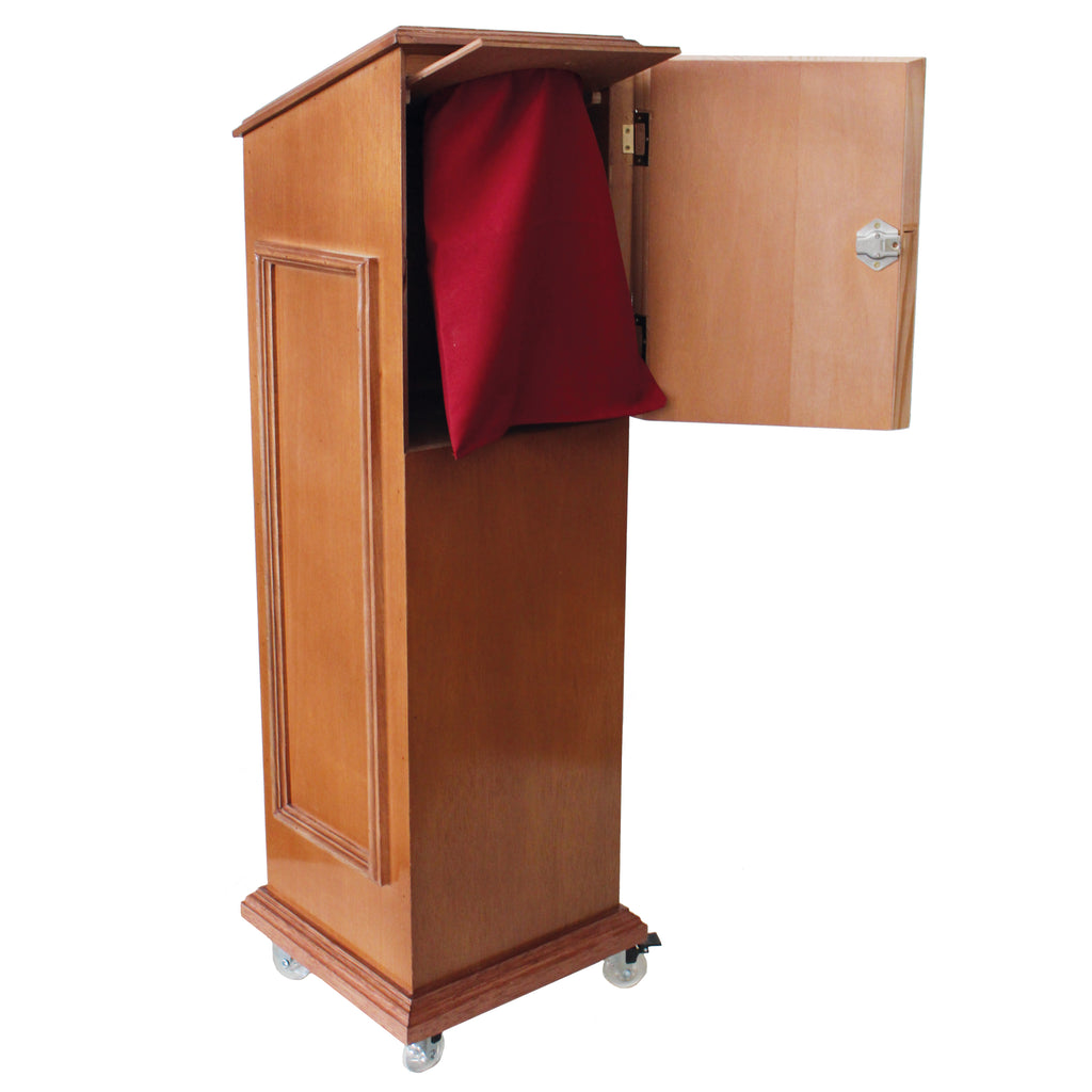 Confeccionado em madeira maciça de jequitibá-rosa, o móvel possui uma porta na parte traseira, dentro da qual está um pequeno saco feito de tecido vermelho, onde as ofertas são armazenadas. Nesta versão, a peça possui rodinhas na base com trava para facilitar a movimentação.